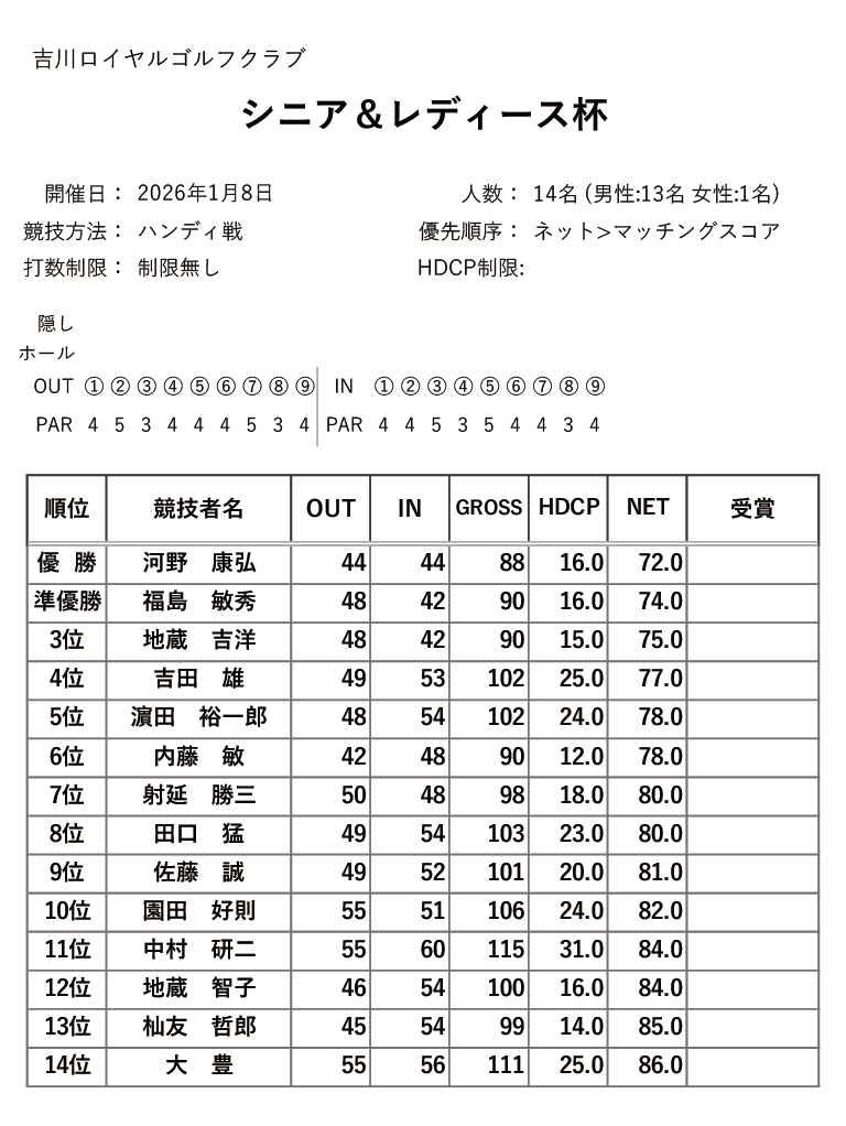 | 14日(木) | シニア&レディース杯 グランドマンスリー | PDF | JPG | |