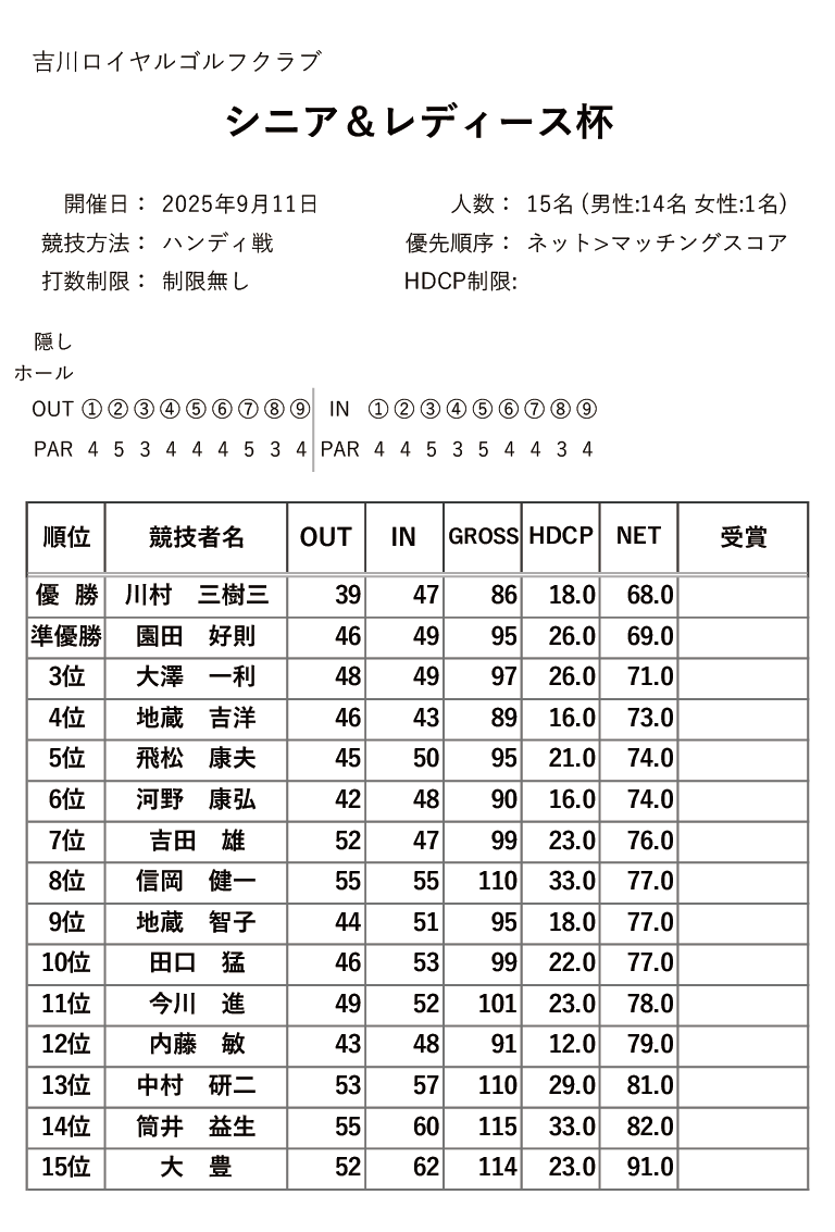 9月に開催されました、シニア&レディース杯、月例杯Aクラス、月例杯Bクラスの結果を掲載いたします。