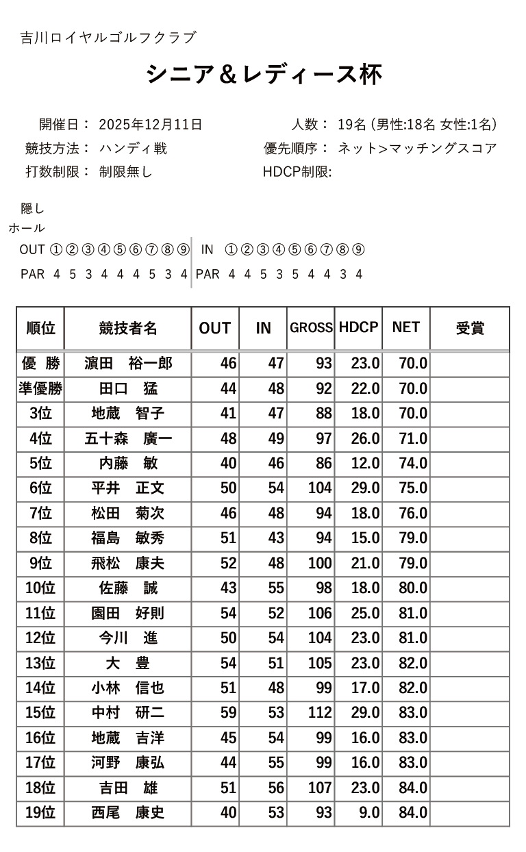 12月に開催されました、シニア&レディース杯の結果を掲載いたします。